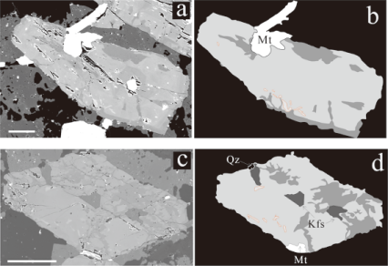 通过详细的岩相学和BSE研究发现,铁山成矿岩体具有非常复杂的角闪石期次(图1),结合角闪石的主微量成分大致可以分为早中晚三期,早期角闪石在~5km的岩浆房结晶,中晚两期角闪石在~3km位置形成。