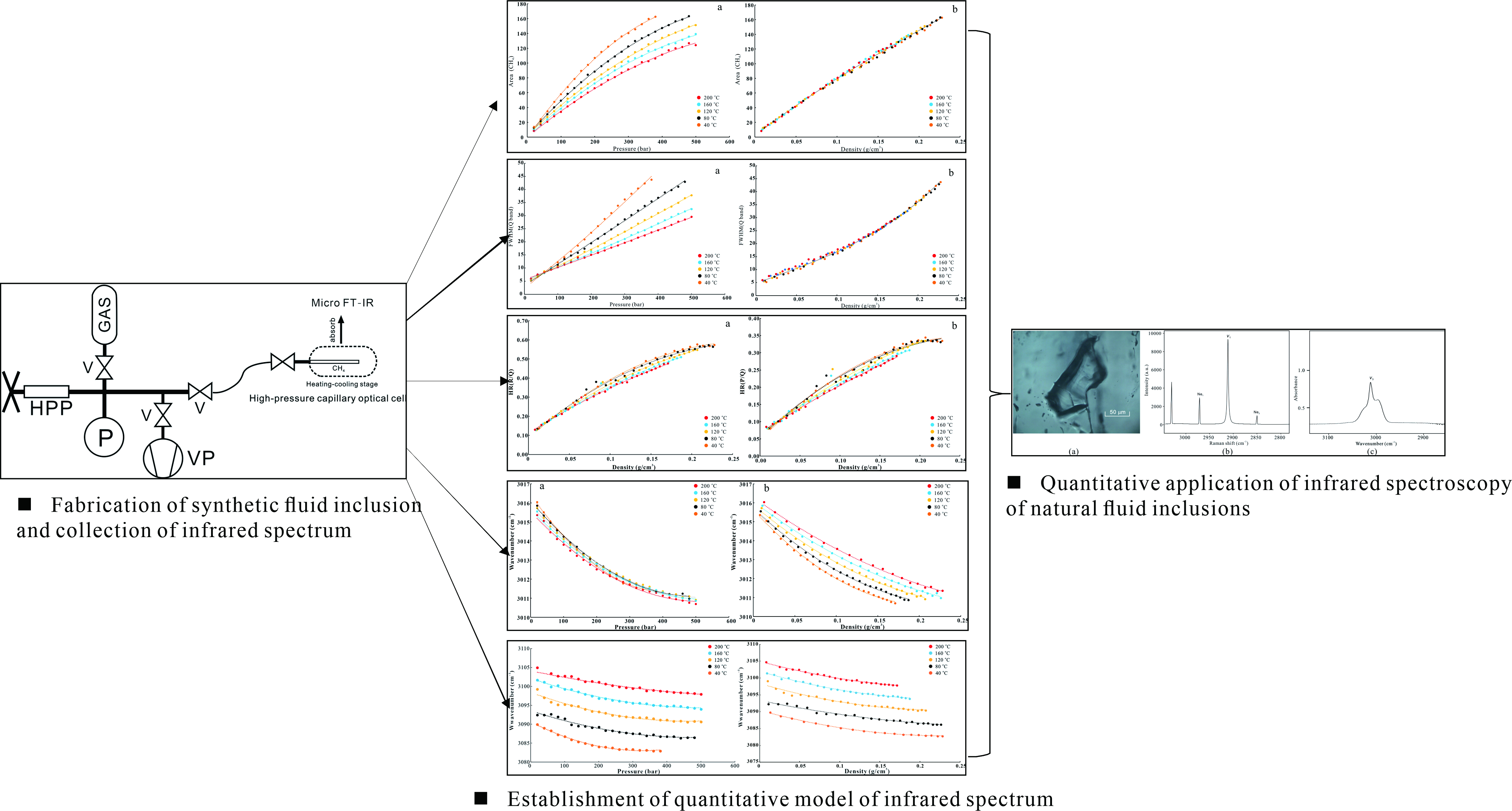 本次研究首次建立了甲烷(40-200oC,2-50 MPa)和二氧化碳(40-120oC,6-50 MPa)体系下傅里叶红外光谱参数与温度-压力-密度的定量模型(图1),同时分别对阿尔卑斯山中央区石英脉体内多个纯甲烷天然流体包裹体和莺歌海盆地的纯二氧化碳流体包裹体应用了傅里叶红外光谱的定量方法,此研究不仅创新性的采用傅里叶红外光谱定量分析应用于流体包裹体地球化学研究方向,同时比较了傅里叶红外技术与激光拉曼技术的优缺点,为下一步含甲烷和二氧化碳多元体系傅里叶红外光谱定量打下了基础。黄亚浩为论文第一作者,合作者包括sunbet官方网站文志刚教授、中石油勘探开发研究院陶小晚高工、杭州地质研究院乔占峰教授等。该研究得到国家自然科学基金资助项目支持。(审核 孟强)