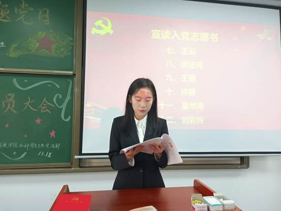 大会开始,由16名发展对象逐一宣读入党志愿书,表达自己的入党动机。申请入党的同学都真情的表达了对党的向往,对党的忠诚,表示坚定不移跟党走,为共产主义事业奋斗终生。随后依次由各入党负责人对发展对象的培养、教育以及政审情况提出意见,做出详细的评议。所有正式党员进行讨论并充分发表各自意见,拥有表决权的党员对预备党员进行了无记名投票表决,最终16名发展对象正式成为预备党员。