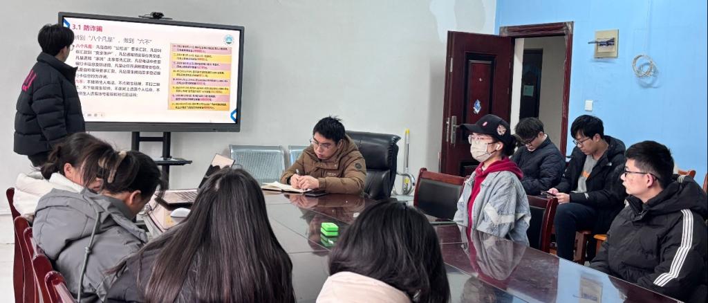 会上,宿建部刘锦华提醒大家在元旦假期中要时刻保障自身交通、消防以及食品安全,提高相应安全意识及防范知识。黄鹏老师强调同学们要提高防诈骗意识,遇到诈骗中的“八个凡是”一定要做到“六不”,用经典案例告诫同学遵守交通及消防安全,始终把自身安全放在首位;最后要求各班安全员扎实开展班级安全班会,切实提高同学们的假期出行安全意识。