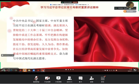 随后,各班团支书带领同学们认真学习了习近平总书记在湖北考察时的重要讲话精神。各团支部积极组织支部成员在总书记的重要讲话中学精神、悟思想、践行动,以坚定的理想信念引领青年思想、服务青年成长、凝聚青年力量。本科生们表示将在日常学习中努力提升自己的专业素养,为湖北的发展储备知识;研究生们则表示会在科研项目中积极探索,力求将科研成果转化为实际生产力,助力湖北经济社会的高质量发展 。