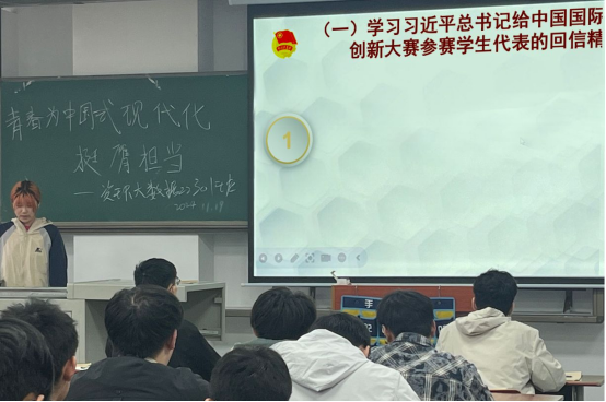 会议伊始,各班团支书带领同学们深入学习了习近平总书记给中国国际老员工创新大赛参赛员工代表的回信精神。团支书强调,创新是人类进步的源泉,而青年作为创新的重要生力军,肩负着重大使命。广大青年应弘扬科学精神,积极投身科技创新,努力促进中外科技交流、推动科技进步,在中国式现代化的广阔天地中更好地展现自身才华。同学们深刻认识到,在这个科技日新月异的时代,作为新时代的青年学子,无论是本科生还是研究生,都应积极响应号召,将创新思维融入到学习与科研中,为国家的科技发展贡献自己的智慧与力量。
