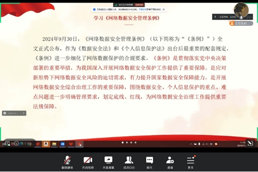 最后,各班团支书带领同学们学习了习近平总书记关于促进高质量充分就业的重要讲话精神,并一同学习了《网络数据安全管理条例》。通过学习,同学们更加清楚地认识到自身责任的重大。同时,同学们也深刻认识到网络数据安全的重要性,无论是在学习还是未来的工作中,都将严格遵守相关条例,为维护国家网络安全贡献一份力量
