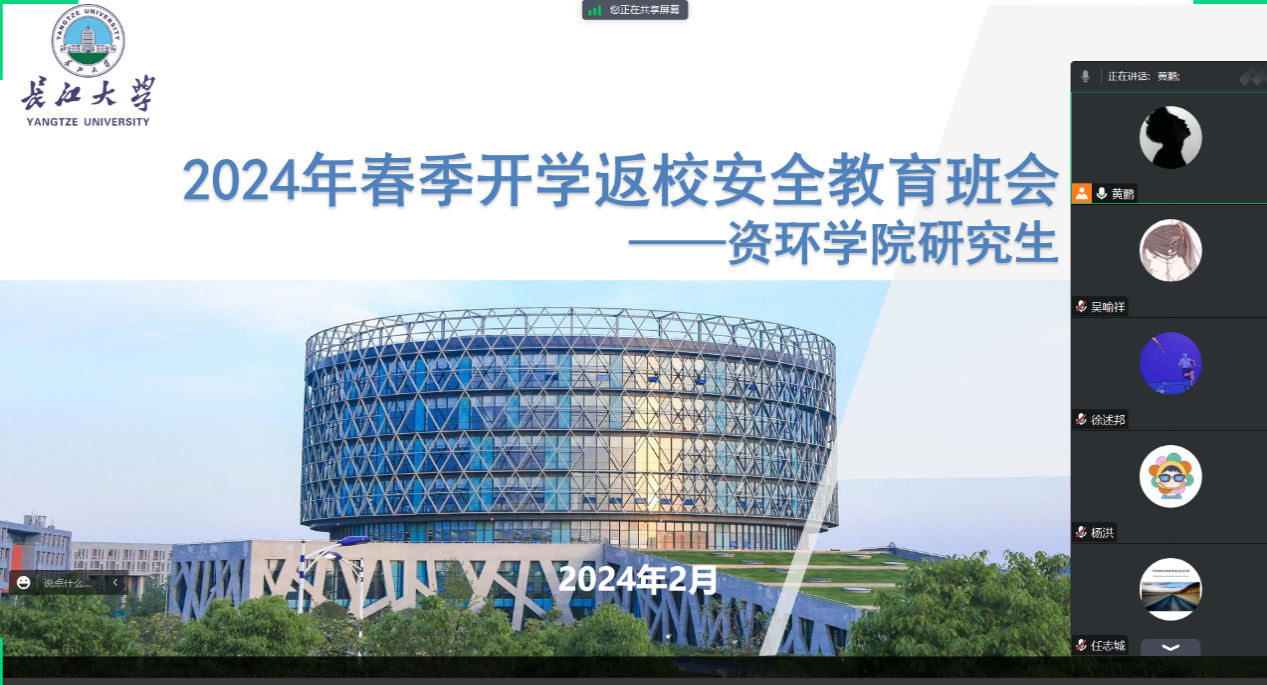 (通讯员 刘锦华/图 杨家旭/文)假期临近尾声,随着返校高峰的到来,为进一步确保同学们平安到校,sunbet于2月21日中午12:00召开2024年春季学期返校线上安全会议。会议由学工办主任李春花老师主持,研究生辅导员黄鹏老师、本科生辅导员郭政老师协助,宿建部与全体安全委员参与。