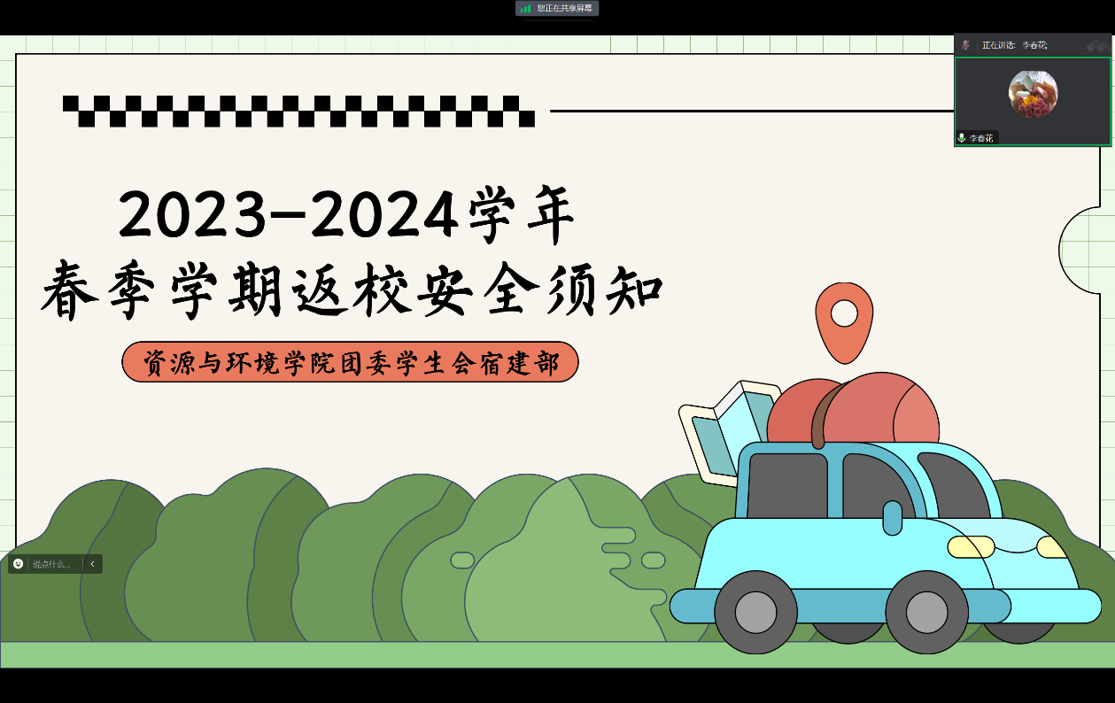 会上,宿建部成员刘锦华通过PPT的讲解,从报到时间,返校须知及路途安全三方面展开,向各安全委员讲述了返校时同学们应要注意返校前携带全个人物品,返校途中注意保护个人财产安全,并时刻注意气候变化,返校后及时整理寝室等各项事项。李春花老师强调提前返校和延迟返校员工需及时报备,近期天气恶劣,要求同学们在返校途中注意自身安全,提高防诈意识,同时提醒同学们开学后积极备战补考、诚信应考。