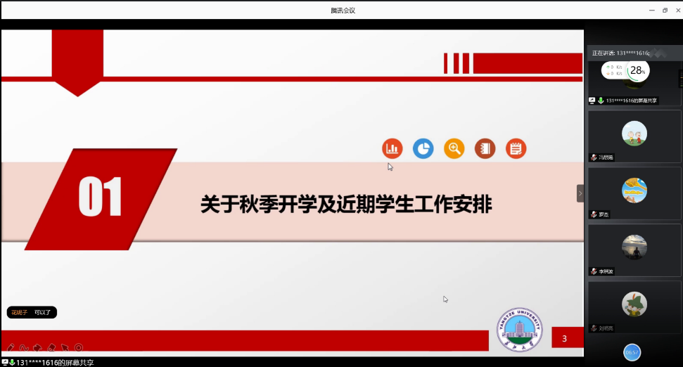 (通讯员 刘思雨/图 李婉婷/文)全国上下万众一心,共同抗击疫情数月后,各地疫情基本已经得到控制,我们也终于看到了胜利的曙光。8月21日下午3点,sunbet官方网站sunbet公司于线上腾讯会议进行了一场班主任会,本次会议主要是关于秋季开学及近期员工的工作安排。本次会议由范梅英书记主持,所有班主任老师出席本次会议。本次会议的目的主要是讲述如何利用开学前的这一段时间,严防死守、群控群防,确保各项防控措施得到落实,扎实做好春季开学各项疫情防控准备工作。