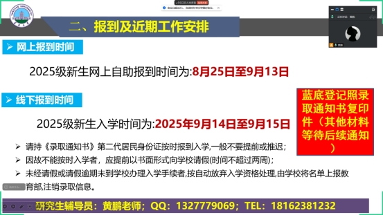 (通讯员 黄鹏)金秋送爽,丹桂飘香,为欢迎2025级研究生新同学,帮助他们提前了解新环境、开启新篇章,公司于2025年9月5日在线上召开“梦想起航,安全至上”2025级研究生开学主题班会。研究生辅导员黄鹏老师及2025级新生参加。