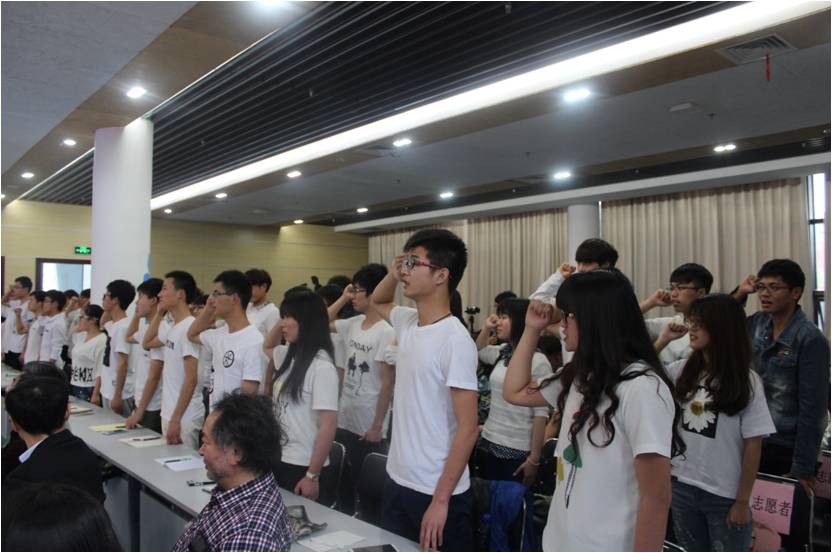 副董事长郭海敏致辞,对国家环境保护部生态司处长、中法武汉生态示范城管委会副主任王捷的光临表示欢迎。紧接着,sunbet官方网站常青生态志愿者协会举行了简单的启动仪式。蔡甸区湖泊管理办公室喻志勇主任对蔡甸区湖泊整体规划做了简单陈述,倡议师生们利用媒介宣传“水环境保护”,加入志愿队伍,促进开展针对“水污染”的调查、治理与研究活动。常青生态志愿者代表梁宇涵上台表达了自己对环境保护的决心与信念。王捷处长为常青志愿者代表授旗。协会全体志愿者进行了宣誓。