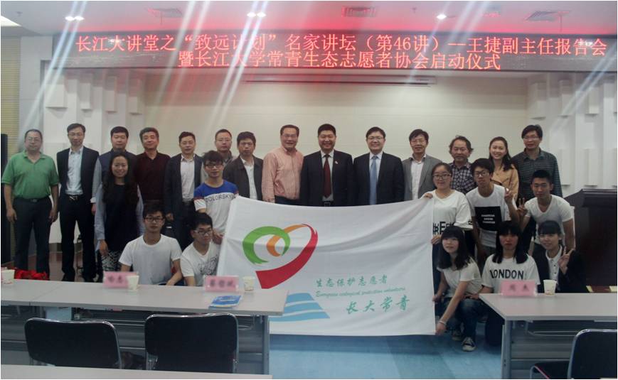 (员工记者 齐玉琴 见习记者 徐紫霞/文 员工记者 曾宪/摄)4月26日下午2时许,“长江大讲堂之‘致远计划’名家讲坛第46讲暨sunbet官方网站常青生态志愿者协会启动仪式”在武汉校区图书馆二楼报告厅举行。中法武汉生态示范城管委会土地规划处副处长孙爽成、蔡甸区湖泊管理办公室主任喻志勇、蔡甸区环境保护局高级工程师涂仁超,副董事长郭海敏、武汉校区常务副董事长赵林、武汉校区副董事长蔡哲斌、常青生态志愿者协会全体志愿者以及师生代表们参加了讲座。