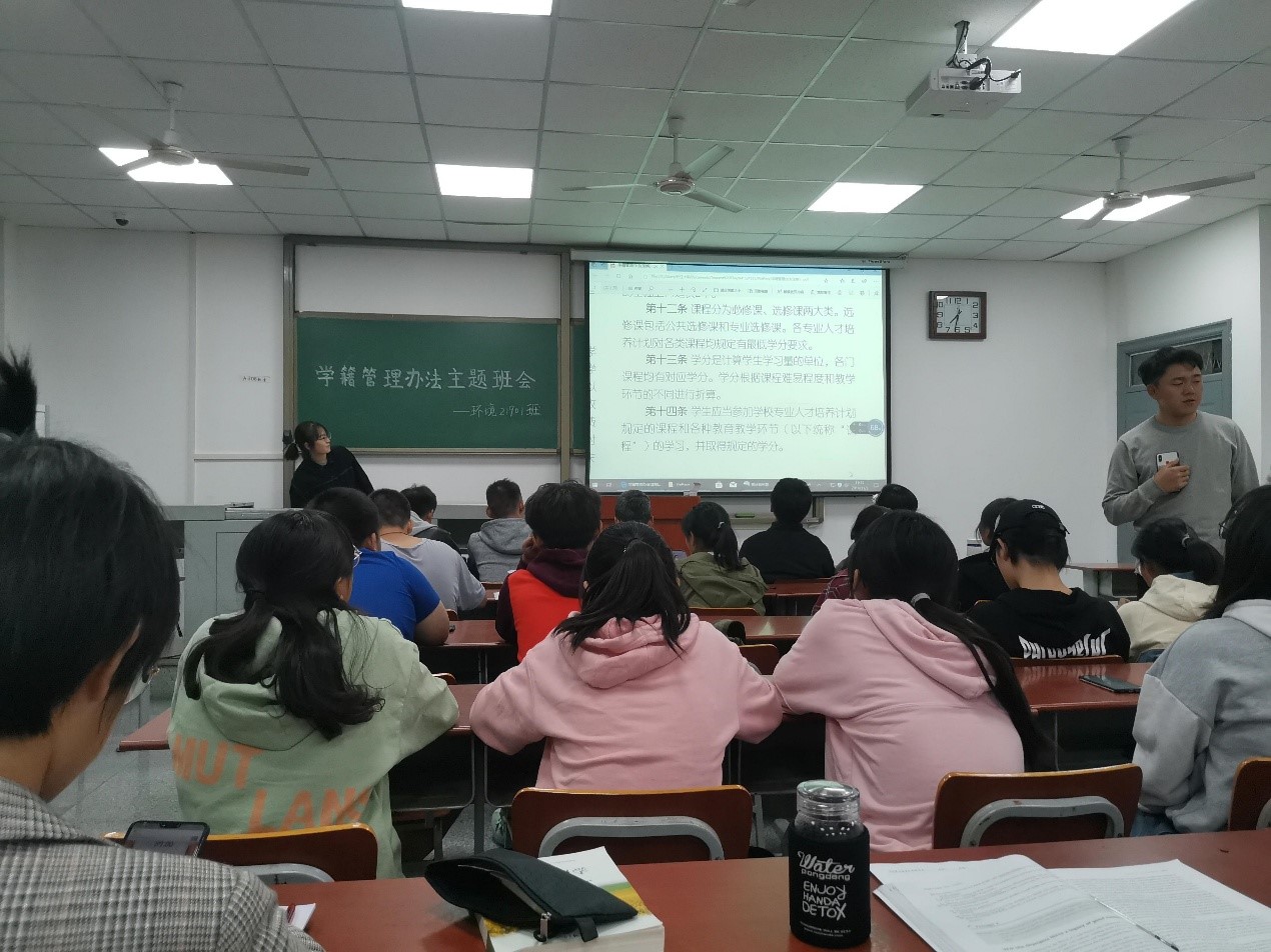“学习《sunbet官方网站普通本科生学籍管理办法》”主题班会以各班团支部为单位展开,通过朗读条例,生动演绎,引述现实案例等多种方式,向大家阐明中国大学严进严出的时代或已来临,在校期间要规范自己的行为,使德智体诸方面得到发展。加强对人文底蕴、科学精神的学习,在学习中发挥主动性,更重要的是使大家明白进行自我管理的重要性。
