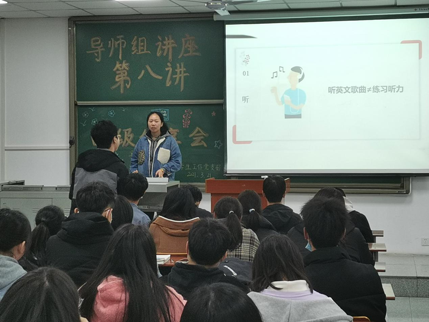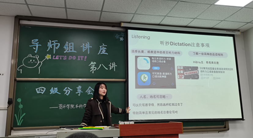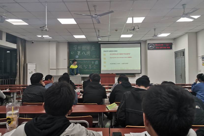 林舒敏学姐向我们介绍了四级考试的题型,并详细地说明了每个题型应该需要花费的时间。随后,林舒敏学姐通过自己的实践感受,向20级同学推荐了几个好用的英语学习APP,如墨墨背单词,喜马拉雅,考虫等,又提醒大家考前多关注博主周思成,以获取更多考前模拟题。她还强调得阅读者得天下,但勤于练习不等于疯狂刷题,要注意方法。在她的推荐之下,同学们得到了更多学习英语的途径,同时也很大地调动了大家的学习积极性。