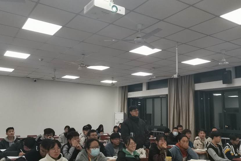 田润丰学长更侧重于向同学分享答题技巧。他介绍了四级考试的一些注意事项,如在听听力时,涂写答题卡需要边听边涂,作文需要在三十分钟内写完等。在交代考试注意事项事项后,为了使大家更好理解,采用互动的方式向在场各位展示了几个选词填空题答题,通过同学们参与回答及讲述做题感受,再来分析其中的技巧,使得现场的氛围活跃了起来,同时也大家更深刻直观地感受到了四级考试的难度以及需要做的准备。